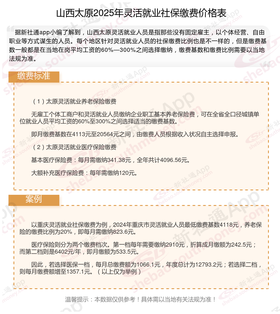灵活就业社保是指针对灵活就业人员的社会保险制。灵活就业人员包括个体经营者、自由职业者、临时工等,他们没有固定的雇主,因此需要自行缴纳社会保险。那么2025年山西太原灵活就业人员社保需要交多少钱?下面随新社通小编一起来看看。