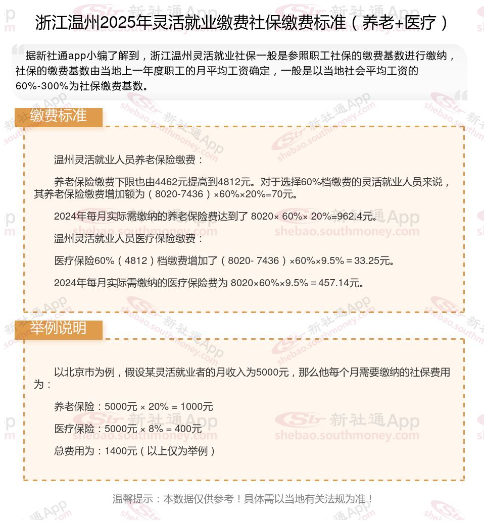 随着经济社会的不断发展,灵活就业群体日益壮大,其社保缴费问题也愈发受到关注。那么2025年浙江温州灵活就业人员社保需要交多少钱,缴费比例是多少?下面随新社通小编一起来看看。