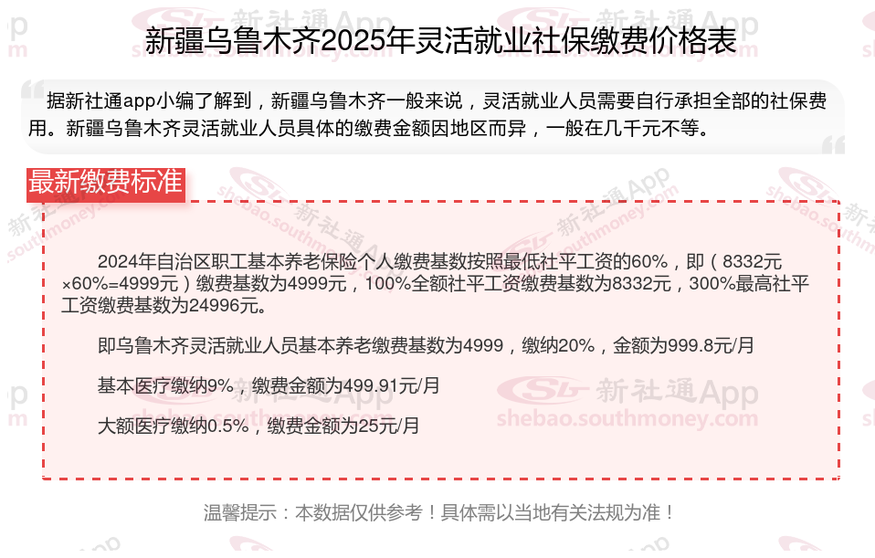 2025年新疆乌鲁木齐灵活就业人员社保需要交多少钱?灵活就业,作为一种非传统的就业方式,近年来蓬勃发展。为保护这部分人群的权益,国制定了相应的社保缴费法规。2024年,灵活就业社保缴费法规继续完善,涵盖了养老保险、医疗保险、失业保险等多个方面,旨在为灵活就业人员提供全面的社会保证。接下来随新社通APP小编一起来看看。