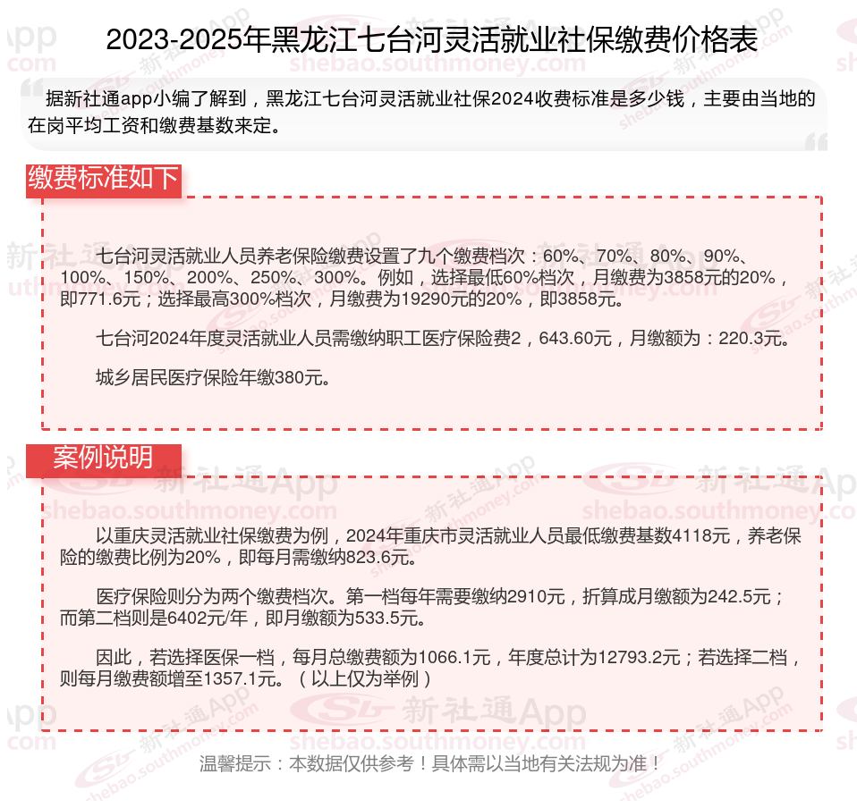 以上就是黑龙江七台河灵活就业社保缴费的全部内容,数据及内容供参考!希望对你有帮助,欢迎关注新社通app解锁更多社保专业资讯。