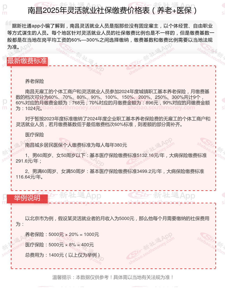 随着经济社会的不断发展,灵活就业群体不断地日益壮大,其社保缴费问题也愈发受到关注。那么2025年南昌灵活就业人员社保交多少钱,你了解2025年南昌灵活就业人员社保缴费基数及比例吗,接下来随新社通APP小编一起来看看。