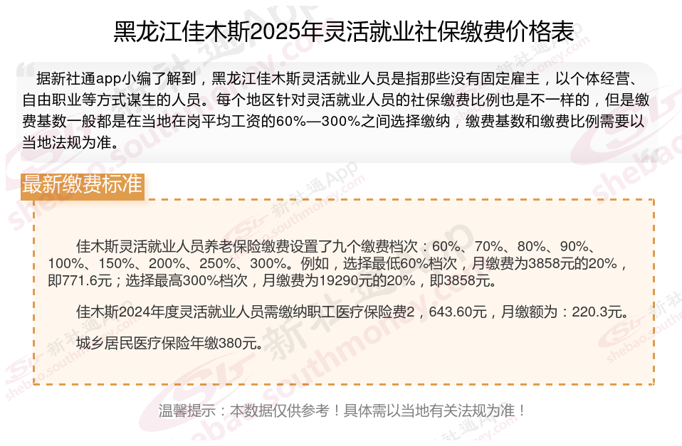 2025年黑龙江佳木斯灵活就业人员社保需要交多少钱?社保缴费的金额取决于多个因素,包括缴费基数和缴费比例,且各地标准存在差异。下面随新社通小编一起来看看。