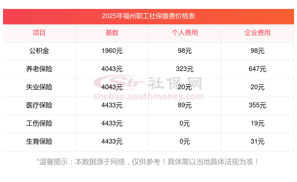 缴纳社保能抵御疾病、失业、养老等重大风险,避免陷入经济困境。也能享受医保报销、养老金增长等红利。社保是劳动者的法定权利,断缴可能影响购房、落户、子女教育等。接下来随社保君了解一下2025年福州社保交多少钱,2025年福州社保缴费标准的详细内容。