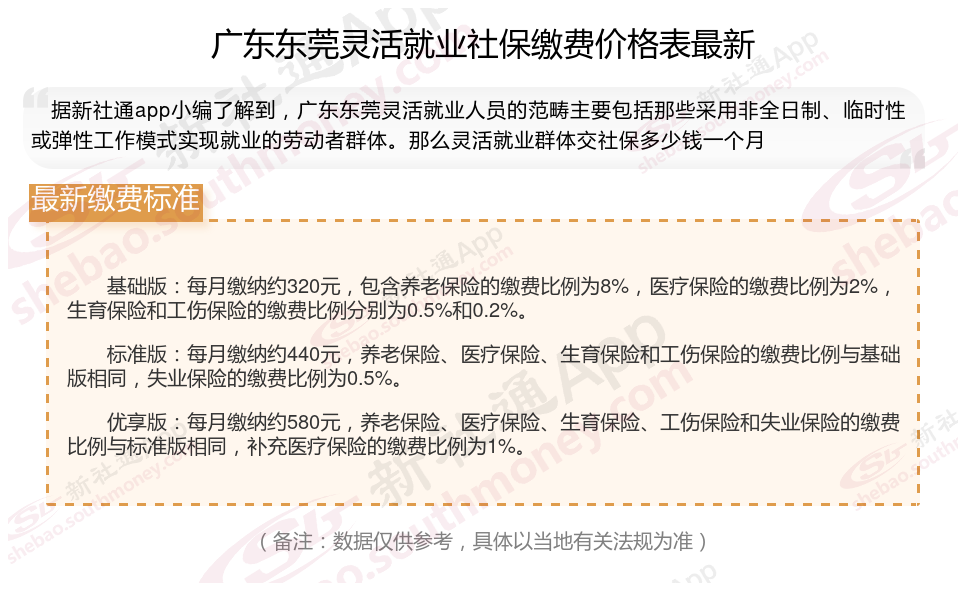 灵活就业社保能抵御疾病、失业、养老等重大风险,避免陷入经济困境。也能享受医保报销、养老金增长等红利。社保是劳动者的法定权利,断缴可能影响购房、落户、子女教育等。接下来随社保君了解一下2025年广东东莞灵活就业人员社保交多少钱,2025年广东东莞灵活就业社保缴费标准的详细内容。