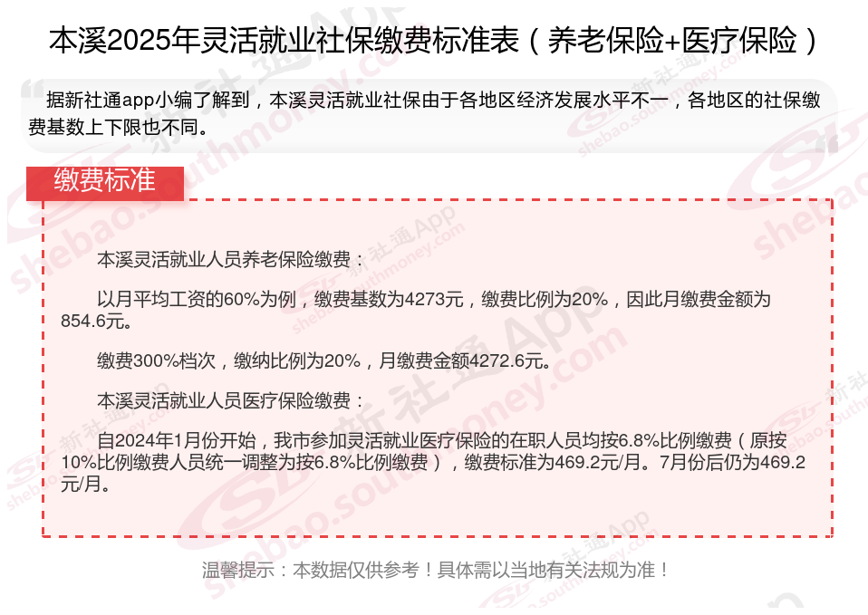 2025年本溪灵活就业人员社保交多少钱,你了解2025年本溪灵活就业人员社保缴费基数及比例吗,据新社通小编了解到,灵活就业社保缴费标准每年都会有所调整,主要体现在缴费基数和缴费比例上。接下来随新社通APP小编一起来看看。