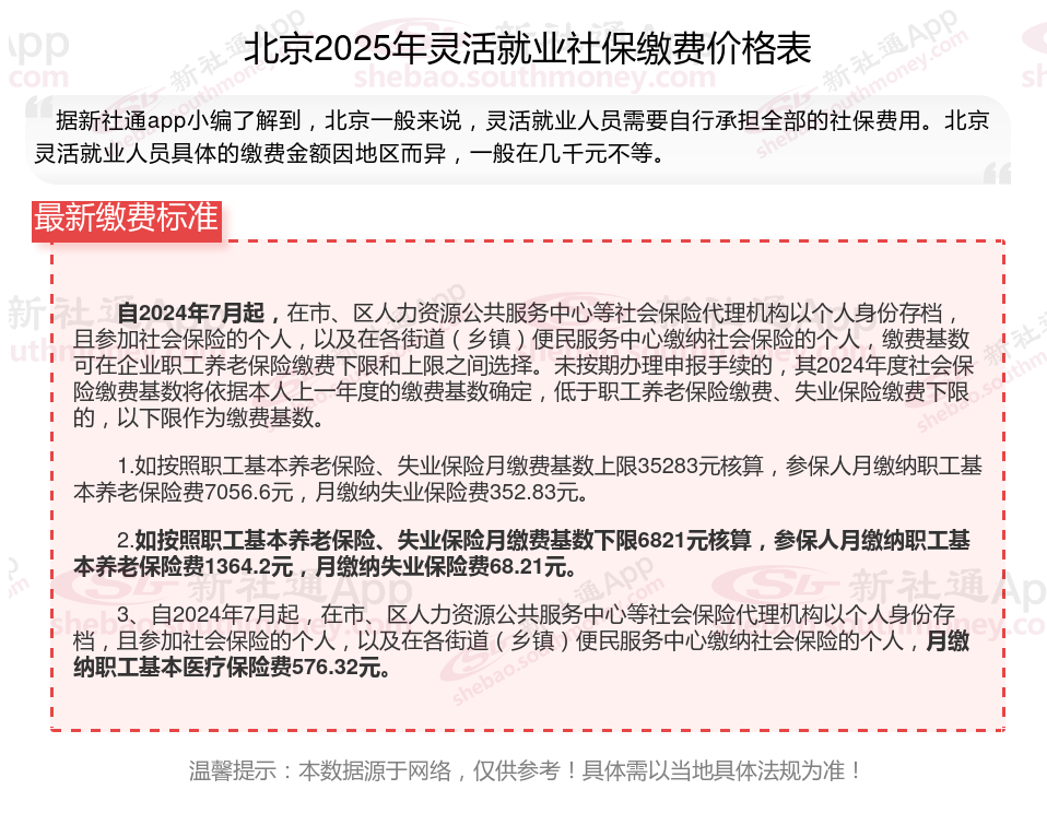 灵活就业社保通常只需缴纳养老和医疗两项(部分地区可自愿选缴失业险),其他险种无需强制缴纳。灵活就业社保缴费满15年后,退休后可领取养老金,避免老年无收入来源。那么2025年北京灵活就业人员社保需要交多少钱?下面随新社通小编一起来看看。