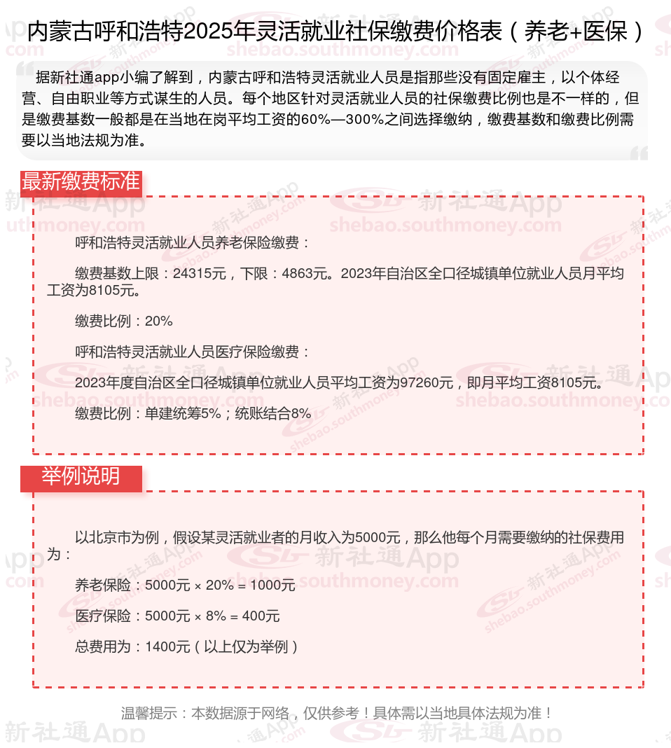 2025年内蒙古呼和浩特灵活就业人员社保需要交多少钱?2025灵活就业社保缴费标准的调整,既体现了法规的连续性,又适应了经济社会发展的要求。灵活就业人员应根据自身情况,合理选择缴费基数和缴费比例,确保自身权益得到充分保证。接下来随新社通APP小编一起来看看。