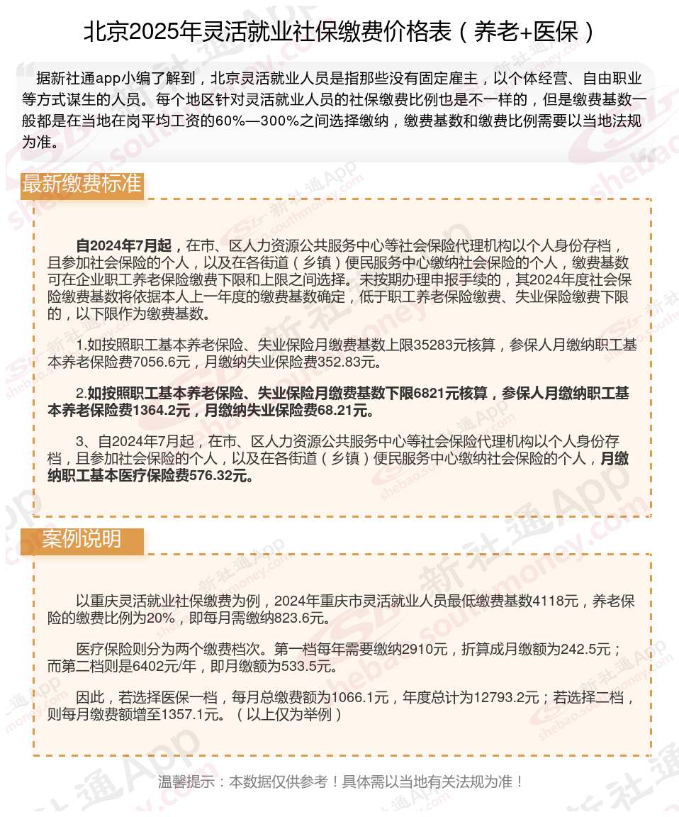 灵活就业社保缴费比例是多少?养老保险一般为缴费基数的20%左右,其中8%计入个人账户,12%计入统筹账户。医疗保险一般为缴费基数的10%左右,具体比例因地区而异。失业保险、工伤保险、生育保险缴费比例较低,具体比例因地区而异。接下来随社保君了解一下2025年北京灵活就业人员社保交多少钱,2025年北京灵活就业社保缴费标准的详细内容。