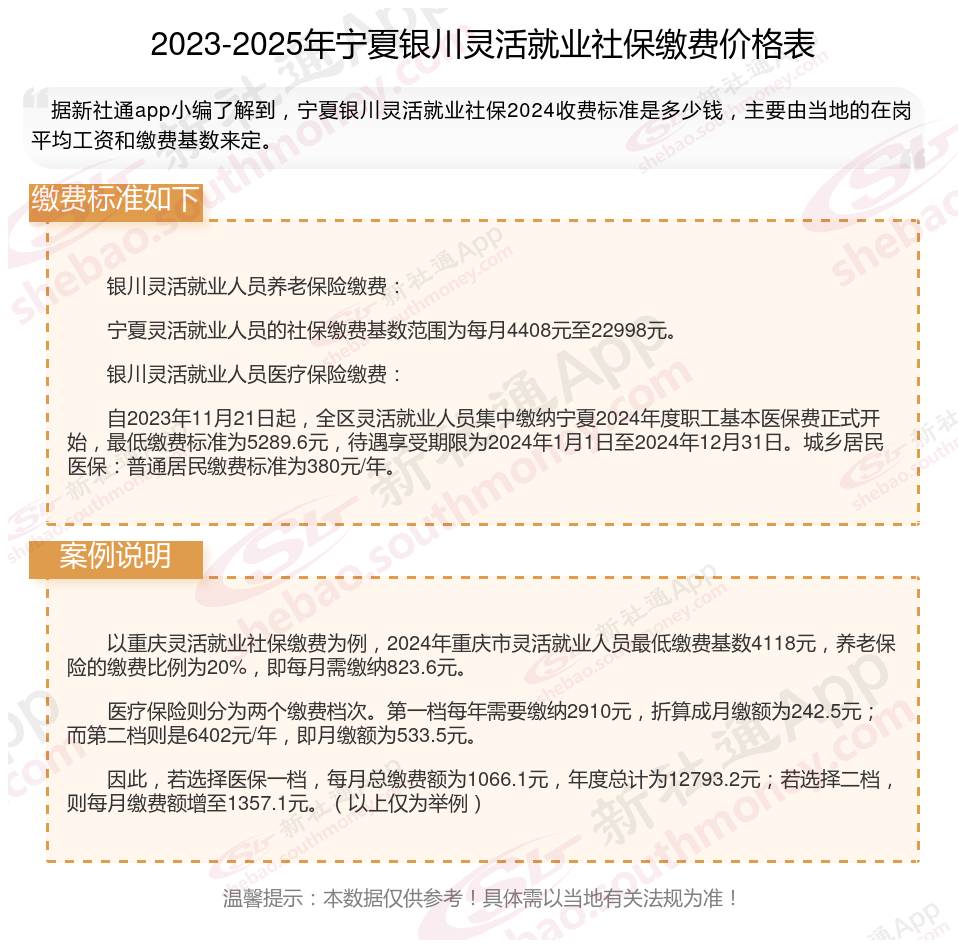(1)宁夏银川灵活就业社保参照职工社保的缴费基数进行缴纳。灵活就业社保由于各地区经济发展水平不一,职工月平均工资存在差异,所以各地区的社保缴费基数上下限也不同。