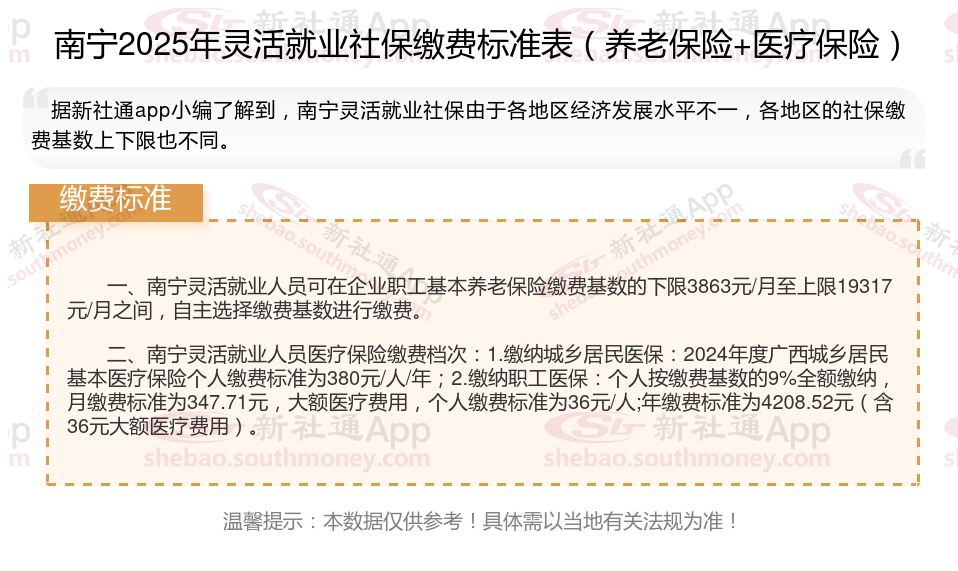 灵活就业社保通常只需缴纳养老和医疗两项(部分地区可自愿选缴失业险),其他险种无需强制缴纳。灵活就业社保缴费满15年后,退休后可领取养老金,避免老年无收入来源。接下来随社保君了解一下2025年南宁灵活就业人员社保交多少钱,2025年南宁灵活就业社保缴费标准的详细内容。
