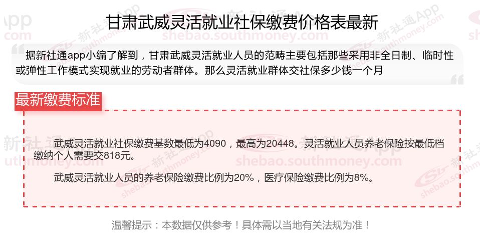 以上就是带来甘肃武威灵活就业社保缴费标准相关知识,内容及数据仅供参考,希望对你有帮助,欢迎关注/下载新社通app解锁更多社保专业资讯。