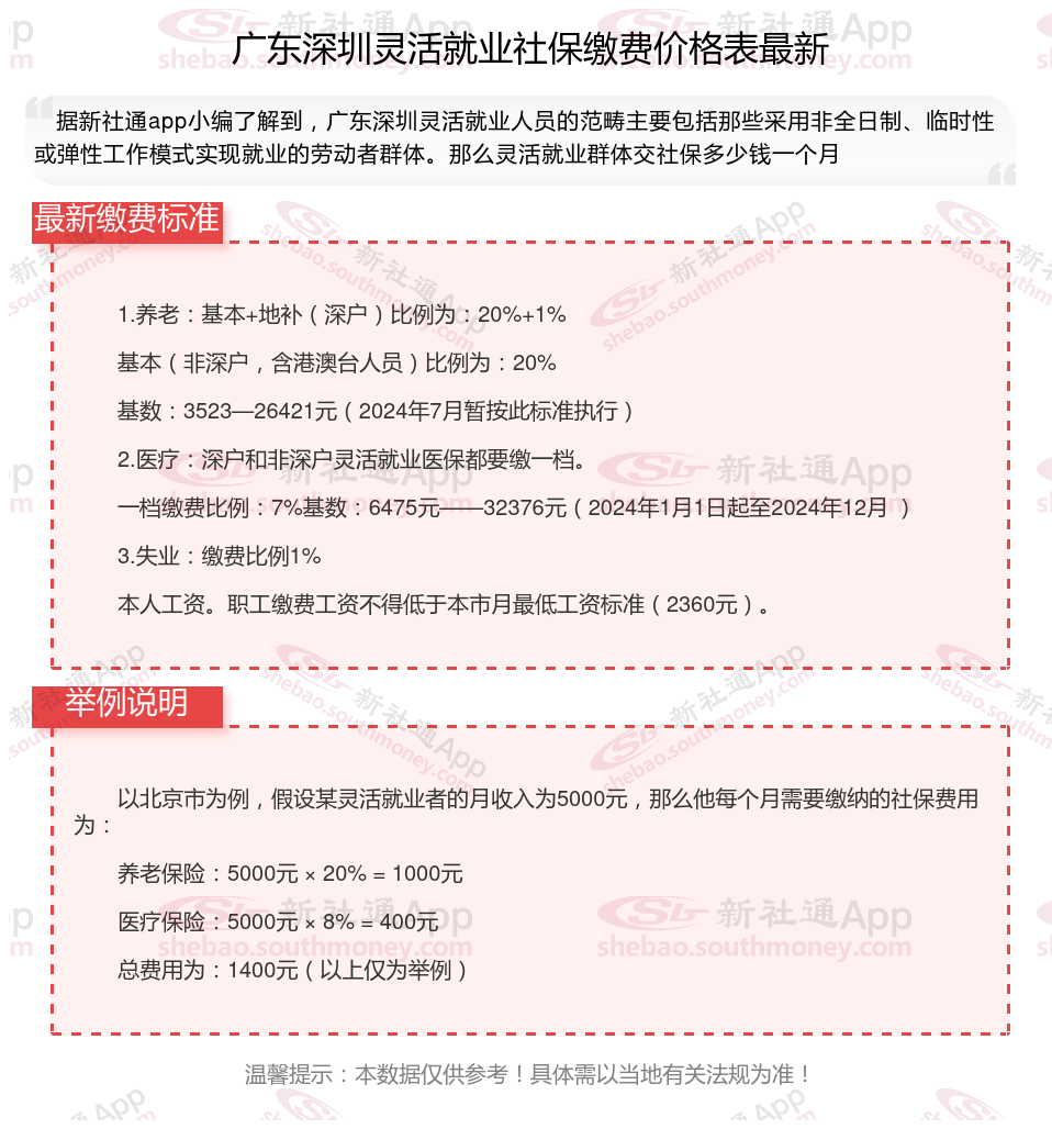 ?深圳地区的灵活就业社保情况?与全国大致相同,也主要包含基本养老保险和基本医疗保险。深圳作为一线城市,其社保法规与国保持一致,灵活就业人员同样需要自行缴纳基本养老保险和基本医疗保险的费用。