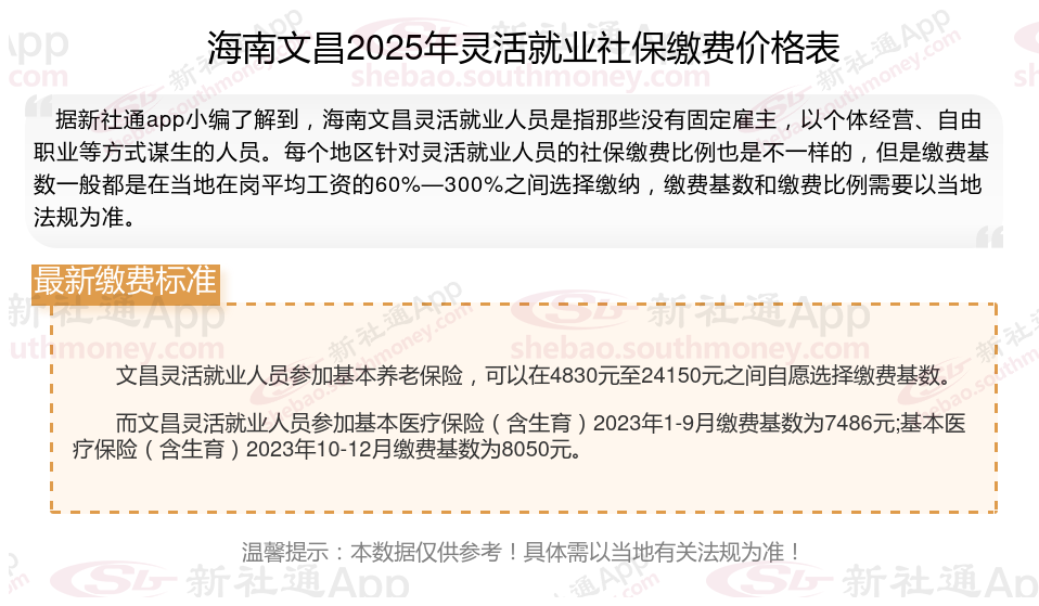 2025年海南文昌灵活就业人员社保需要交多少钱?社保缴费的金额取决于多个因素,包括缴费基数和缴费比例,且各地标准存在差异。下面随新社通小编一起来看看。