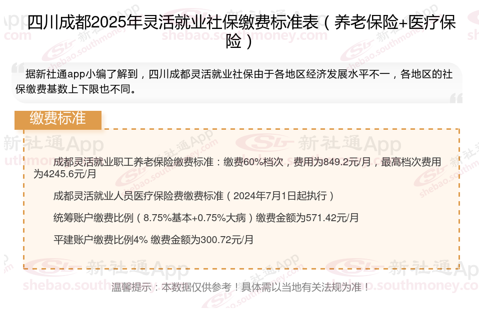 2025年四川成都灵活就业人员社保需要交多少钱?2025灵活就业社保缴费标准的调整,既体现了法规的连续性,又适应了经济社会发展的要求。灵活就业人员应根据自身情况,合理选择缴费基数和缴费比例,确保自身权益得到充分保证。接下来随新社通APP小编一起来看看。