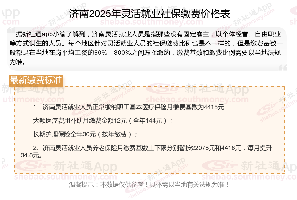 灵活就业社保缴费标准每年都会有所调整,主要体现在缴费基数和缴费比例上。接下来随社保君了解一下2025年济南灵活就业人员社保缴费标准是怎样的的相关内容。