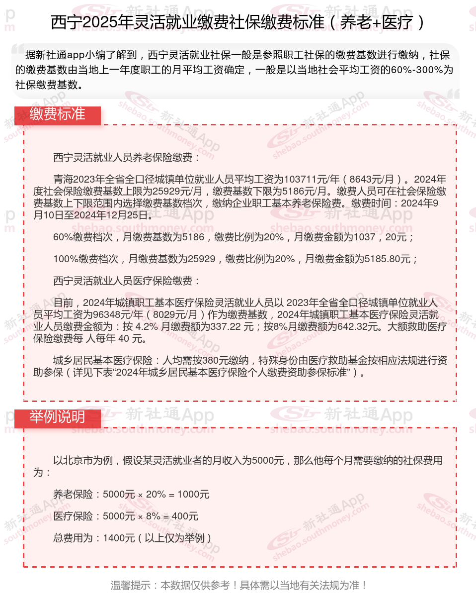 2025年西宁灵活就业人员社保需要交多少钱?随着经济社会的不断发展,灵活就业群体也日益壮大,其社保缴费问题也愈发受到关注。接下来随新社通APP小编一起来看看灵活就业群体社保缴费问题吧。
