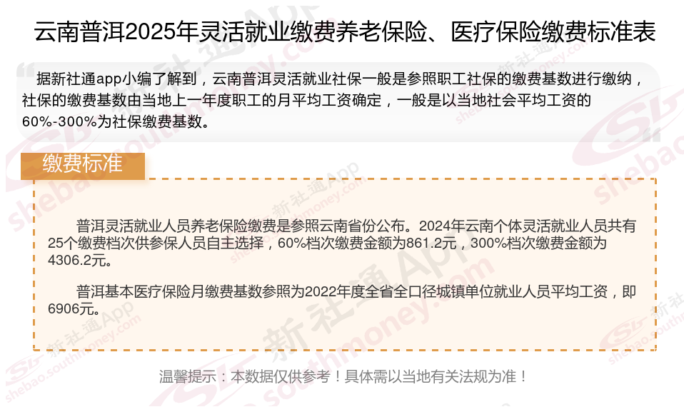 2025年云南普洱灵活就业人员社保需要交多少钱?社保能抵御疾病、失业、养老等重大风险,避免陷入经济困境。也能享受医保报销、养老金增长等红利。社保是劳动者的法定权利,断缴可能影响购房、落户、子女教育等。接下来随新社通APP小编一起来看看云南普洱灵活就业人员社保缴费的内容。