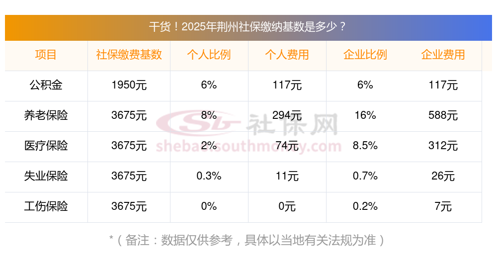 荆州社保个人缴费全解:2025年最新标准,算完心里有数了!据新社通app获悉:荆州企业职工社保缴费基数为:3579.00元。