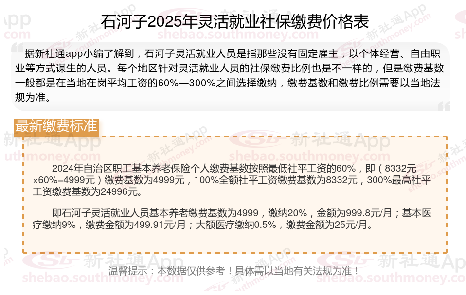 2025灵活就业社保缴费标准的调整,既体现了法规的连续性,又适应了经济社会发展的要求。灵活就业人员应根据自身情况,合理选择缴费基数和缴费比例,确保自身权益得到充分保证。接下来随社保君了解一下2025年石河子灵活就业人员社保交多少钱,2025年石河子灵活就业社保缴费标准的详细内容。