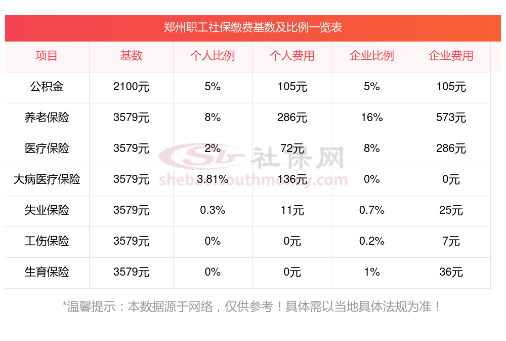 据新社通小编了解到,郑州职工社保缴费基数为:3579.00,个人费用约为:286.32元,企业费用约为:572.64元。