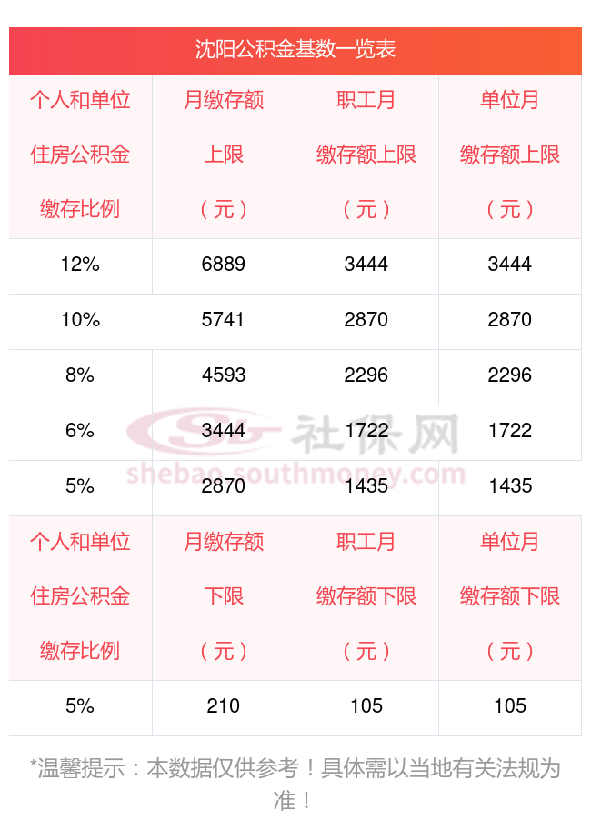 比如沈阳缴纳公积金不同比例金额一览: