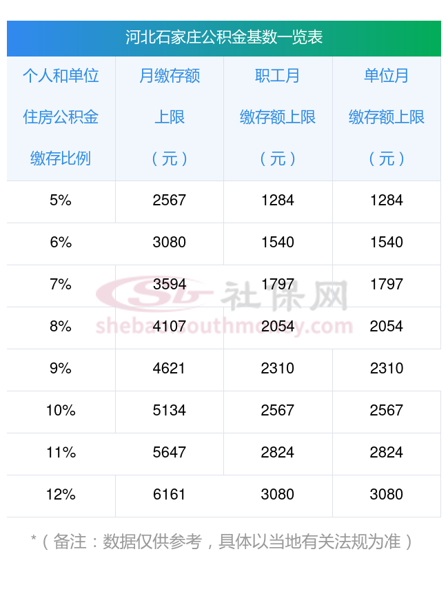 每月缴纳的住房公积金你了解多少?2025年河北石家庄住房公积金年度住房公积金缴存基数上限为35283元。如按照12%的缴存比例,最高每月可缴存8468元,对于不同的缴存比例对于的缴纳金额是不一样的。
