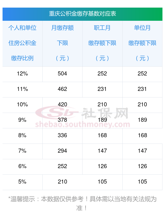 (3)最低月缴存额为重庆为210元(其中:单位105元,个人105元)。