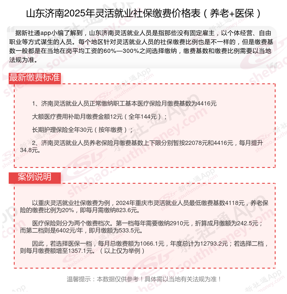 灵活就业社保通常只需缴纳养老和医疗两项(部分地区可自愿选缴失业险),其他险种无需强制缴纳。灵活就业社保缴费满15年后,退休后可领取养老金,避免老年无收入来源。接下来随社保君了解一下2025年山东济南灵活就业人员社保交多少钱,2025年山东济南灵活就业社保缴费标准的详细内容。