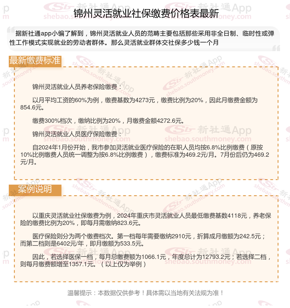 一、2025年锦州灵活就业社保缴费标准表,据新社通小编了解到,锦州社保公积金缴费基数为:3579.00元。