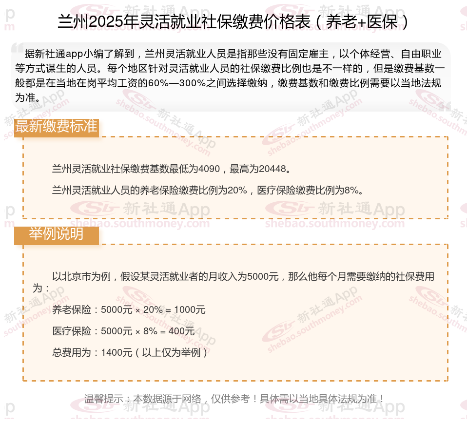 灵活就业社保通常只需缴纳养老和医疗两项(部分地区可自愿选缴失业险),其他险种无需强制缴纳。灵活就业社保缴费满15年后,退休后可领取养老金,避免老年无收入来源。那么2025年兰州灵活就业人员社保需要交多少钱?下面随新社通小编一起来看看。
