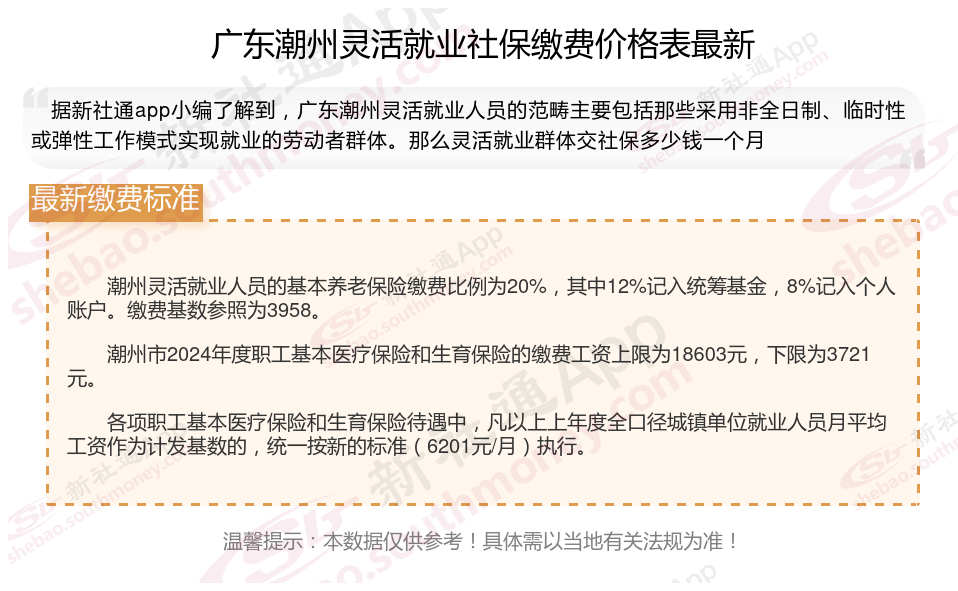 灵活就业社保是指针对灵活就业人员的社会保险制。灵活就业人员包括个体经营者、自由职业者、临时工等,他们没有固定的雇主,因此需要自行缴纳社会保险。那么2025年广东潮州灵活就业人员社保需要交多少钱?下面随新社通小编一起来看看。