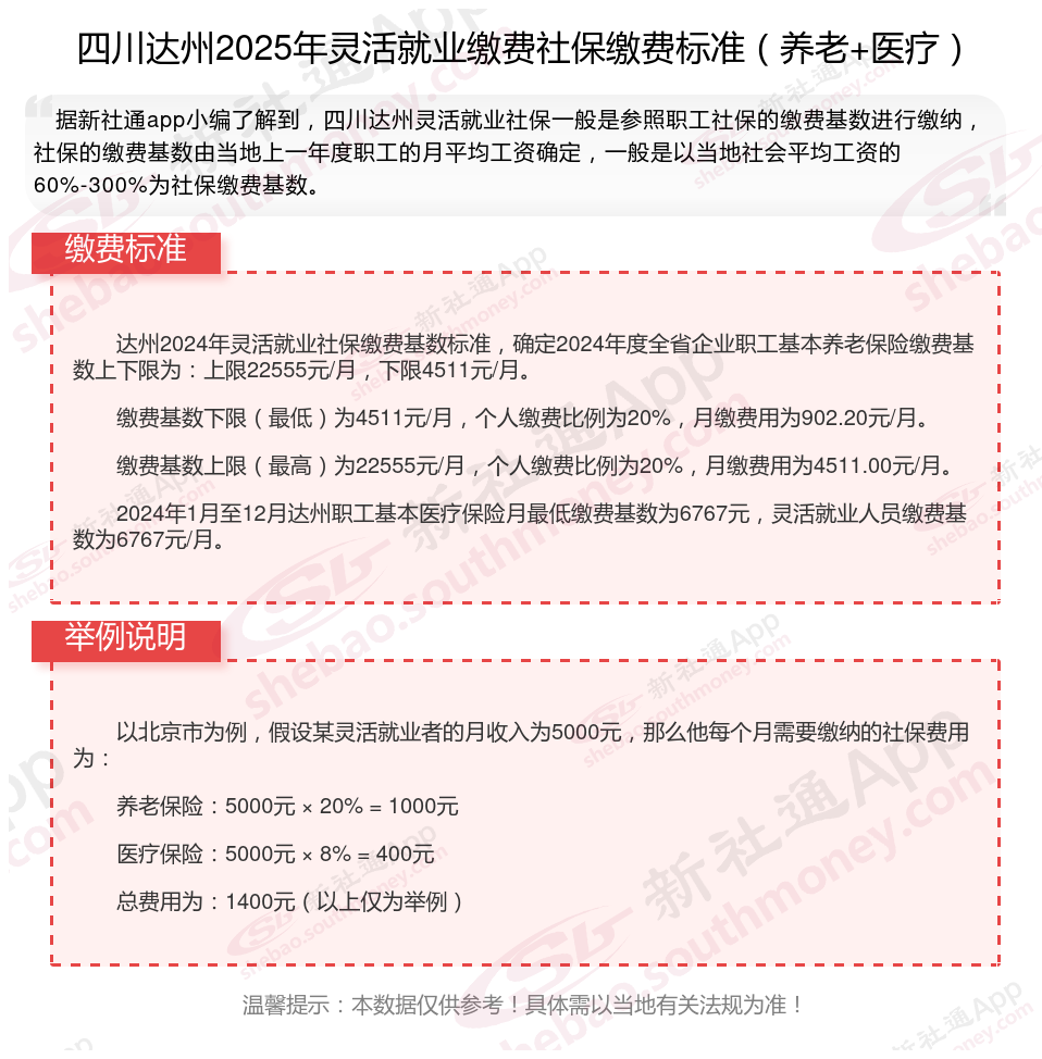 2025灵活就业社保缴费标准的调整,既体现了法规的连续性,又适应了经济社会发展的要求。灵活就业人员应根据自身情况,合理选择缴费基数和缴费比例,确保自身权益得到充分保证。那么2025年四川达州灵活就业人员社保需要交多少钱?下面随新社通小编一起来看看。