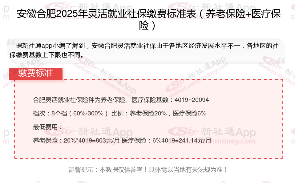 一、2024年安徽合肥灵活就业社保缴费标准表 安徽合肥灵活就业社保多少钱一个月?