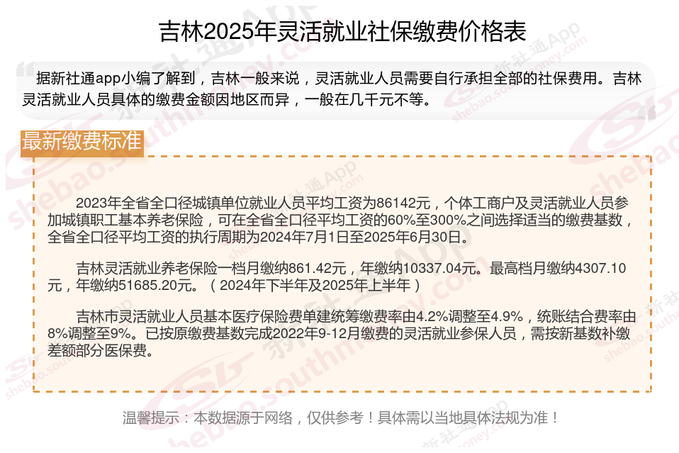 (1)吉林灵活就业社保参照职工社保的缴费基数进行缴纳。灵活就业社保由于各地区经济发展水平不一,职工月平均工资存在差异,所以各地区的社保缴费基数上下限也不同。