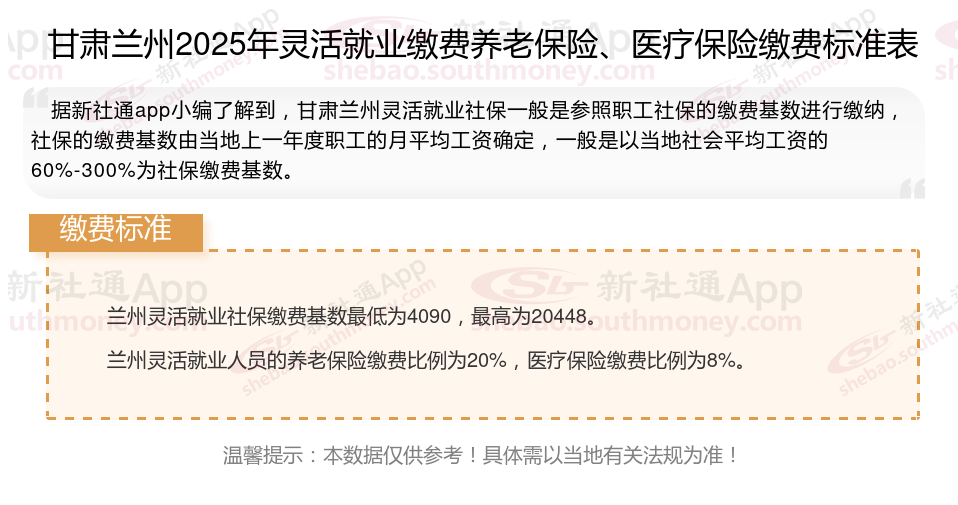 一、2025年甘肃兰州灵活就业社保缴费标准表 2025年甘肃兰州灵活就业社保多少钱一个月?