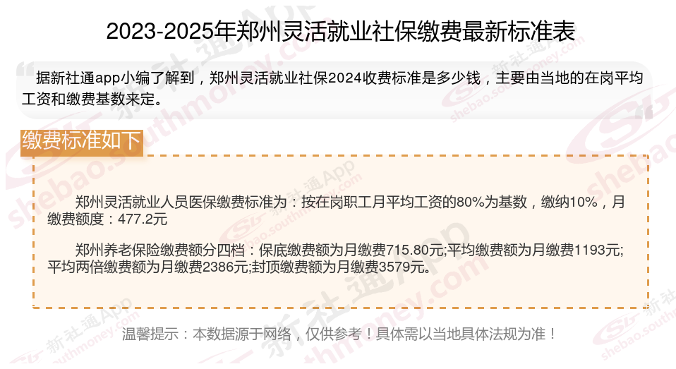 一、2025年郑州灵活就业社保缴费标准表,据新社通小编了解到,郑州社保公积金缴费基数为:3579.00元。