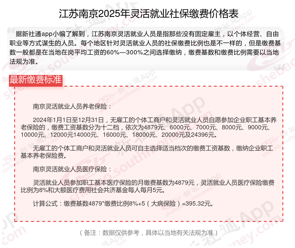 随着经济社会的不断发展,灵活就业群体不断地日益壮大,其社保缴费问题也愈发受到关注。那么2025年江苏南京灵活就业人员社保交多少钱,你了解2025年江苏南京灵活就业人员社保缴费基数及比例吗,接下来随新社通APP小编一起来看看。