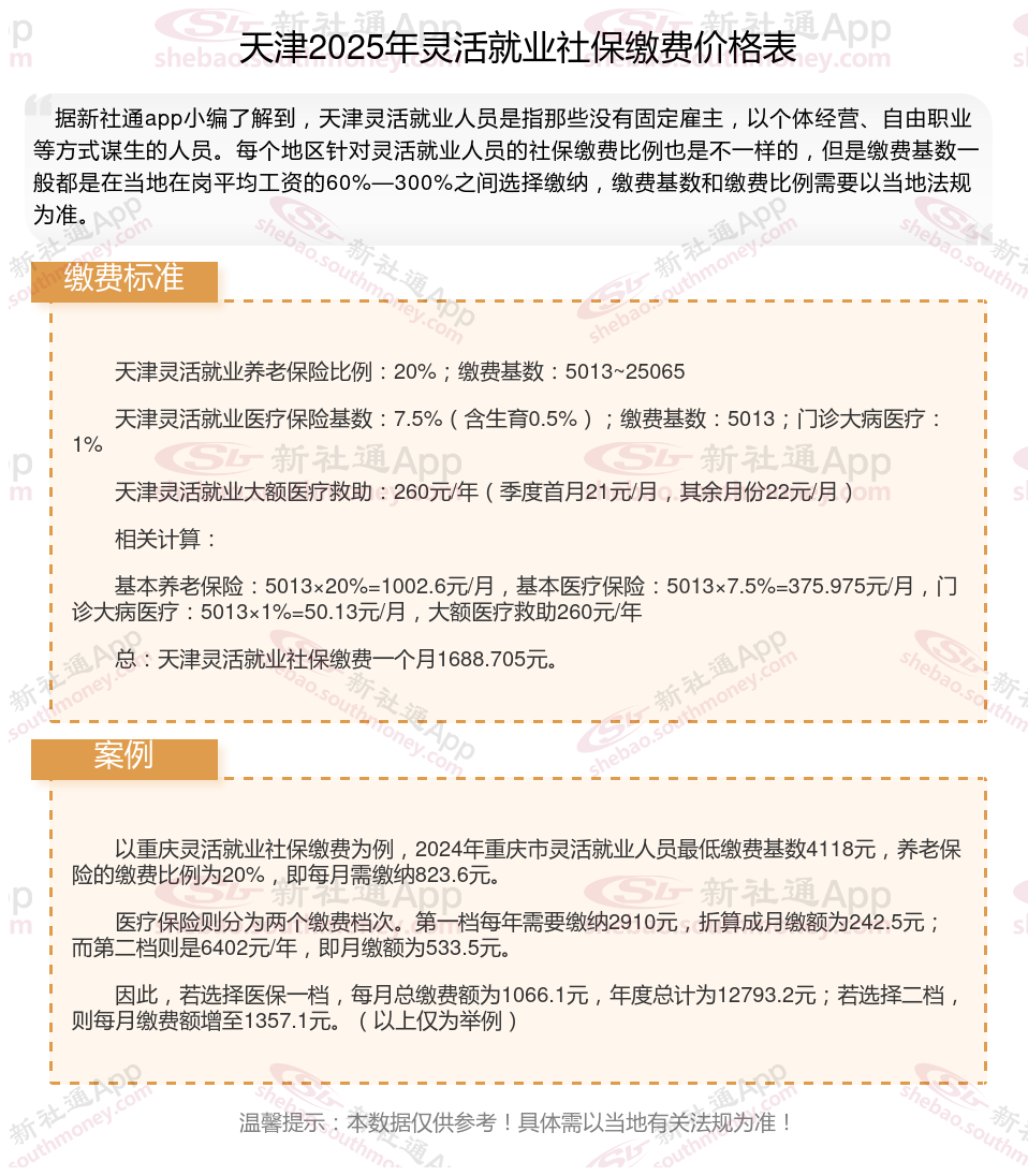 2025年天津灵活就业人员社保需要交多少钱?灵活就业,作为一种非传统的就业方式,近年来蓬勃发展。为保护这部分人群的权益,国制定了相应的社保缴费法规。2024年,灵活就业社保缴费法规继续完善,涵盖了养老保险、医疗保险、失业保险等多个方面,旨在为灵活就业人员提供全面的社会保证。接下来随新社通APP小编一起来看看。