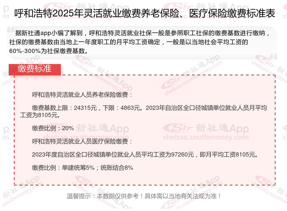 灵活就业社保缴费法规继续完善,涵盖了养老保险、医疗保险、失业保险等多个方面,旨在为灵活就业人员提供全面的社会保证。接下来随社保君了解一下2025年呼和浩特灵活就业人员社保交多少钱的详细内容。