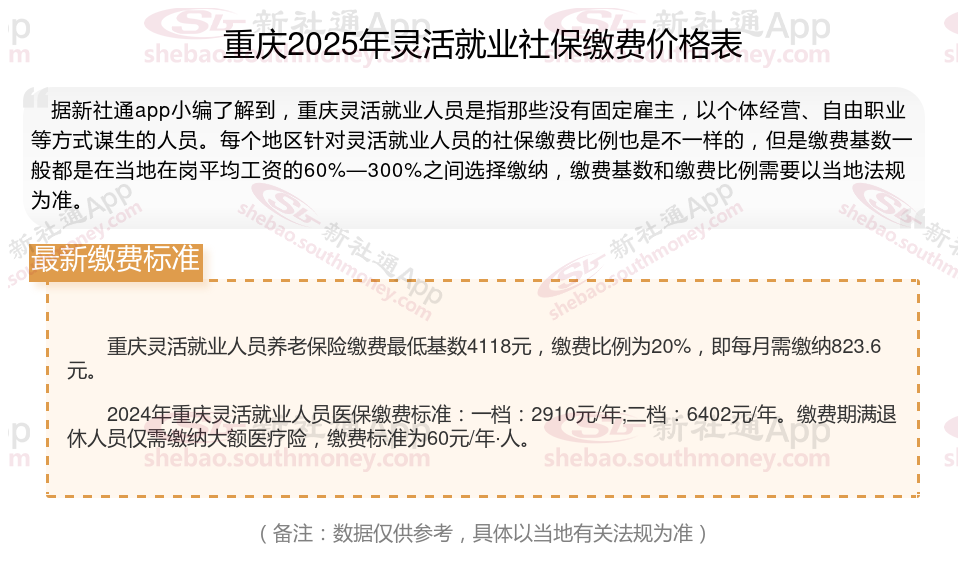 灵活就业社保缴费比例是多少?养老保险一般为缴费基数的20%左右,其中8%计入个人账户,12%计入统筹账户。医疗保险一般为缴费基数的10%左右,具体比例因地区而异。失业保险、工伤保险、生育保险缴费比例较低,具体比例因地区而异。那么2025年重庆灵活就业人员社保需要交多少钱?下面随新社通小编一起来看看。