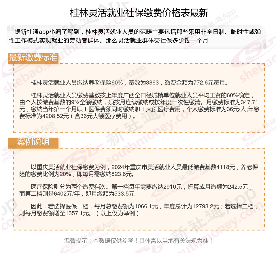 2025灵活就业社保缴费标准的调整,既体现了法规的连续性,又适应了经济社会发展的要求。灵活就业人员应根据自身情况,合理选择缴费基数和缴费比例,确保自身权益得到充分保证。那么2025年桂林灵活就业人员社保需要交多少钱,你了解2025年桂林灵活就业人员社保缴费基数及比例吗,接下来随新社通APP小编一起来看看。