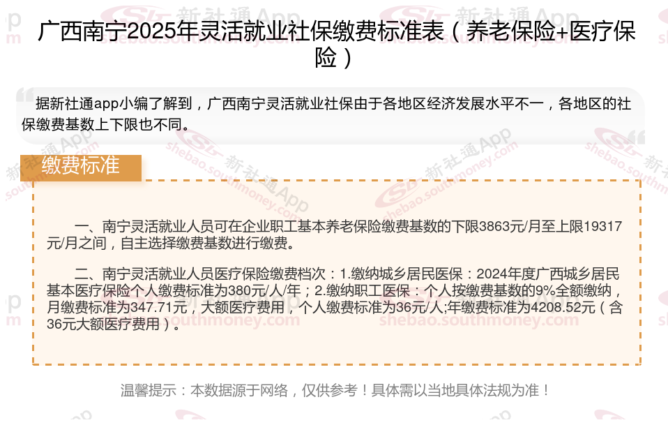 随着经济的发展和社会的进步,灵活就业人员越来越多,但是很多人不知道如何缴纳社保。本文将介绍2025年广西南宁灵活就业人员社保缴费基数及如何缴纳社保,能领取多少钱,帮助大家更好地了解灵活就业社保,随着新社通APP小编一起了解广西南宁灵活就业社保缴费最新资讯吧。