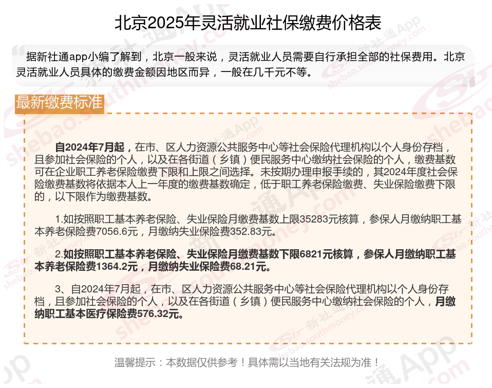一、2024年北京灵活就业社保缴费标准表 北京灵活就业社保多少钱一个月?