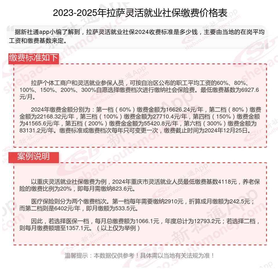 灵活就业社保能抵御疾病、失业、养老等重大风险,避免陷入经济困境。也能享受医保报销、养老金增长等红利。社保是劳动者的法定权利,断缴可能影响购房、落户、子女教育等。接下来随社保君了解一下2025年拉萨灵活就业人员社保交多少钱,2025年拉萨灵活就业社保缴费标准的详细内容。