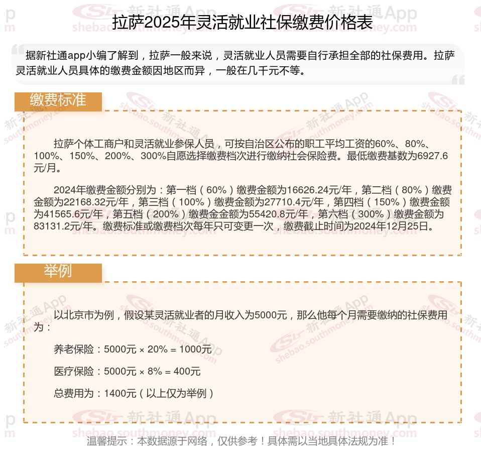 灵活就业社保缴费标准每年都会有所调整,主要体现在缴费基数和缴费比例上。接下来随社保君了解一下2025年拉萨灵活就业人员社保缴费标准是怎样的的相关内容。