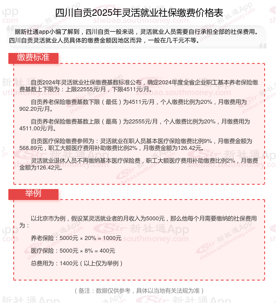 2025年四川自贡灵活就业人员社保需要交多少钱?灵活就业社保通常只需缴纳养老和医疗两项(部分地区可自愿选缴失业险),其他险种无需强制缴纳。灵活就业社保缴费满15年后,退休后可领取养老金,避免老年无收入来源。接下来随新社通APP小编一起来看看四川自贡灵活就业人员社保缴费的内容。