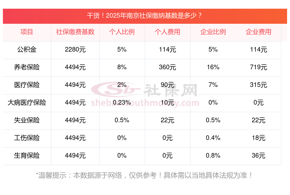 2025年南京社保费用明细表,个人要交多少钱?2025南京职工社保年缴费金额=社保月缴费基数*社保比例*12个月。需要提醒的,各地的社保缴费基数和比例是不一样的,因此,社保每年要交多少钱也是因地而异的。