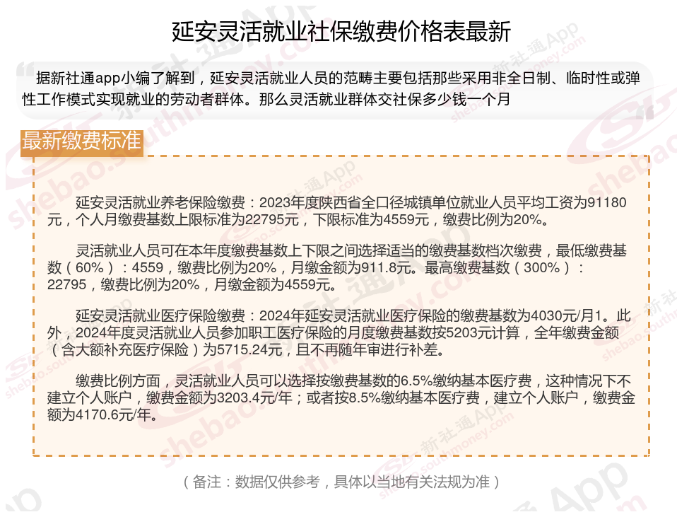 一、2024年延安灵活就业社保缴费标准表 延安灵活就业社保多少钱一个月?
