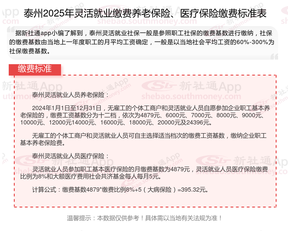 随着经济社会的不断发展,灵活就业群体不断地日益壮大,其社保缴费问题也愈发受到关注。那么2025年泰州灵活就业人员社保交多少钱,你了解2025年泰州灵活就业人员社保缴费基数及比例吗,接下来随新社通APP小编一起来看看。