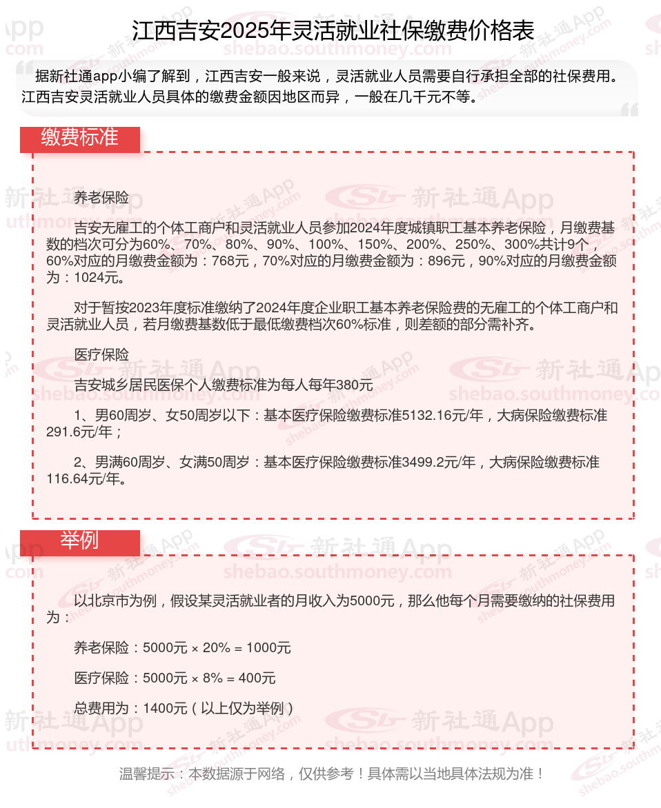2025年江西吉安灵活就业人员社保交多少钱,你了解2025年江西吉安灵活就业人员社保缴费基数及比例吗,据新社通小编了解到,灵活就业社保缴费标准每年都会有所调整,主要体现在缴费基数和缴费比例上。接下来随新社通APP小编一起来看看。